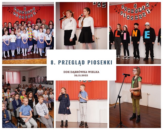 Już po raz 8. na scenie Dzielnicowego Domu Kultury w Dąbrówce Wielkiej zaprezentowali się uczniowie piekarskich placówek oświatowych, biorących udział w Przeglądzie Piosenki. Dzięki niemu udowadniamy, że za pośrednictwem muzyki możemy wyrazić siebie, zaprezentować się przed szeroką publicznością, a przede wszystkim wziąć udział w niezwykłym wydarzeniu muzycznym. Celem konkursu była prezentacja i popularyzacja piosenki w wykonaniu dzieci, konfrontacja dorobku wokalnego młodych osób oraz zespołów, a także promocja młodych talentów. W konkursie prezentowali się soliści oraz zespoły w dwóch grupach wiekowych w klasach I - III oraz w klasach IV – VI, a Jury oceniając występy zwracało uwagę na staranność wykonania, dobór repertuaru do wieku i możliwości wykonawcy, walory głosowe oraz ogólną prezentację i wyraz artystyczny. Po wszystkich prezentacjach odbyło się podsumowanie i wyłoniono laureatów konkursu, którymi zostali:
