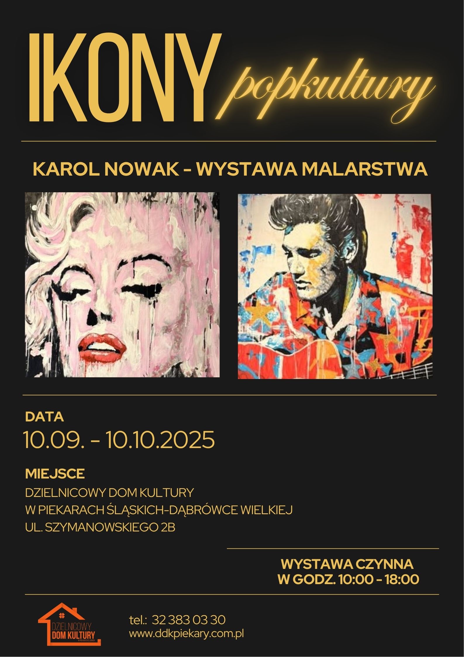 Od 10 września w DDK w Dąbrówce Wielkiej czynna była wystawa malarstwa nosząca tytuł „Ikony popkultury”, której autorem był Karol Nowak. Artysta urodził się w Lędzinach, aktualnie mieszka w Żorach w dzielnicy Baranowice. Pasjonuje się wszystkim co prawdziwe i niepowtarzalne, a zwłaszcza malarstwem i muzyką, które kocha. Jest pasjonatem sztuki, amatorem, który samodzielnie zdobył warsztat artystyczny. Już od 2010 roku Jego pierwsze prace wystawiane były w rodzinnej miejscowości, gdzie prowadził zajęcia z rysunku węglem (głównie portrety) oraz malarstwa w stylu pop art. Jego abstrakcyjne obrazy to idealna forma dekoracji, która tworzy niepowtarzalny klimat. Obrazy zwykle tworzy na rzeczach z odzysku, teraz są nimi płyty drewniane. Kolory odnoszą się do różnorodnych aspektów ludzkiego doświadczenia. Przedstawienie emocji, myśli i energii, które przenikają się nawzajem, wszystko to tworzy złożony obraz, który zachęca do interpretacji. Zapraszamy do obejrzenie wystawy w godz. 10:00 – 18:00.
